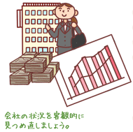 先ほどお話しした「ヒト・モノ・カネ」の動きを知ることが、事業承継計画を作成する最初のポイントになります。会社のあらゆる数値・情報・ノウハウなどを明確化し、「何となく分かっていた…」という程度の会社の状況を客観的に見つめ直して、課題の発見や今後の経営方針や経営目標の設定を行います。