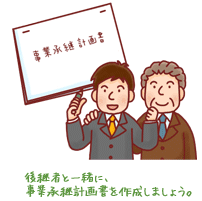 引き継ぎ計画のイメージを固めたら、事業承継計画書を作成しましょう。計画書の作成は経営者が一人で行うのではなく、後継者と一緒に行いましょう。計画書の作成を後継者と一緒に行うことで、経営者と後継者が、問題意識を共有できるようになるはずです。計画書には、いつ、どのタイミングで、何をするのかということと同時に、売上高や利益といった具体的な目標数値を挙げておくことも必要です。事業承継計画書の具体例は、中小企業庁のホームーページに掲載されていますので、参考にしてみると良いでしょう。